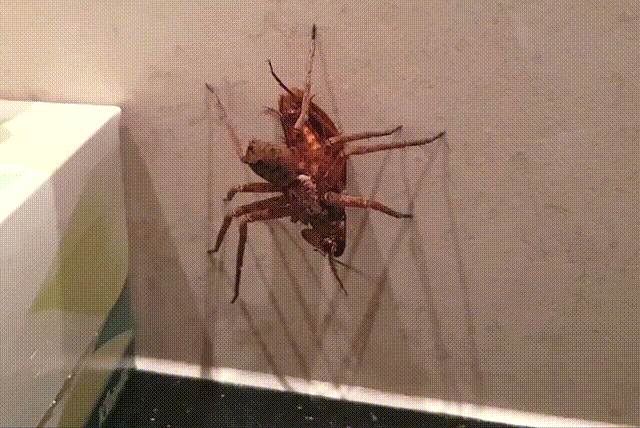 答:首先你要不怕这种蜘蛛.我给你放个蜘蛛在卫生间的捕食动图,你先观摩一下(滑动下方动图查看).反正我是接受不了.