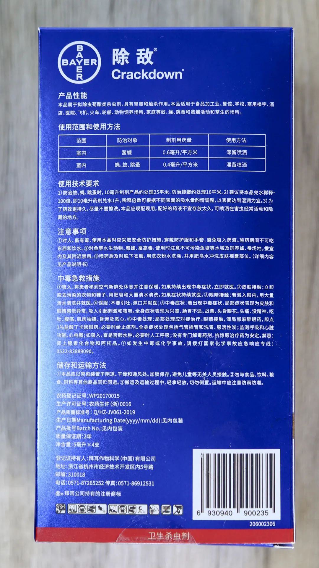 拜耳的除敌喷剂含有溴氰菊酯(25克/升),可以有效防治蚊子、蝇、跳蚤。使用时请仔细阅读盒子背面的使用需知哦。