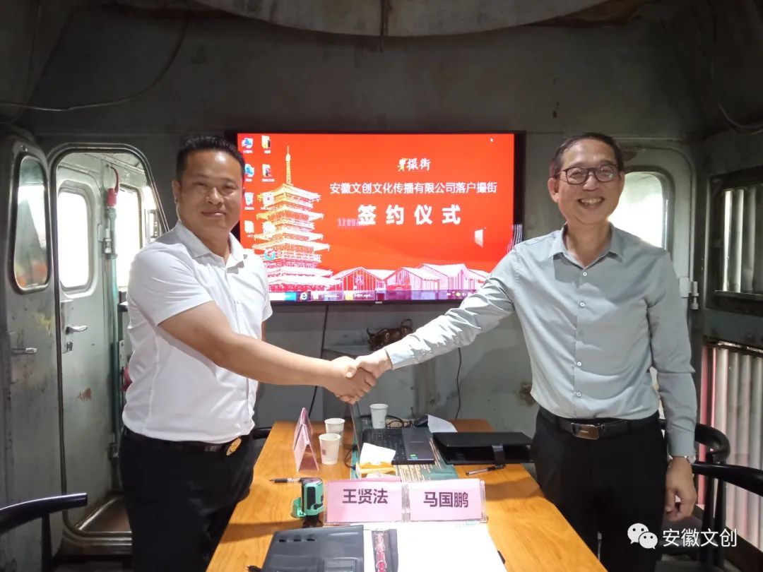 2021年 0 5月23日上午,安徽文创落户撮街签约仪式在撮街东风7543火车头会议室举行,省纪委监察厅原巡视员李磊,省委党校原副校长金乃俊,省委党校研究生部原主任李景道,安徽省文史研究馆馆员、安徽历史文化研究中心主任翁飞博士,省经理人联合会会长张耀峰,撮镇镇政协联络组组长吴庆海等嘉宾共同出席见证。安徽文创产业发展集团董事长王贤法与撮街合众商管总经理马国鹏 签署入驻协议。