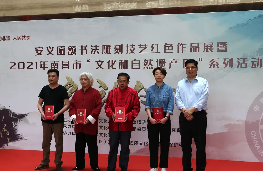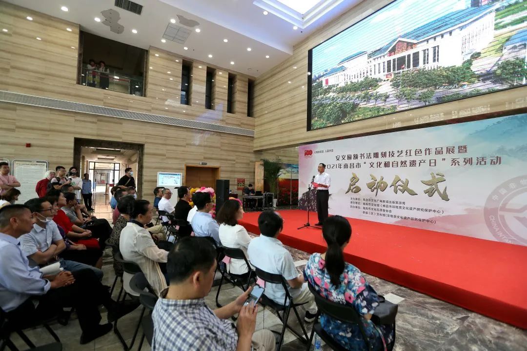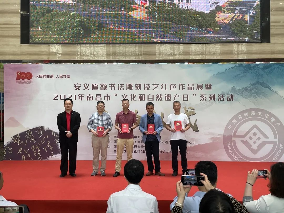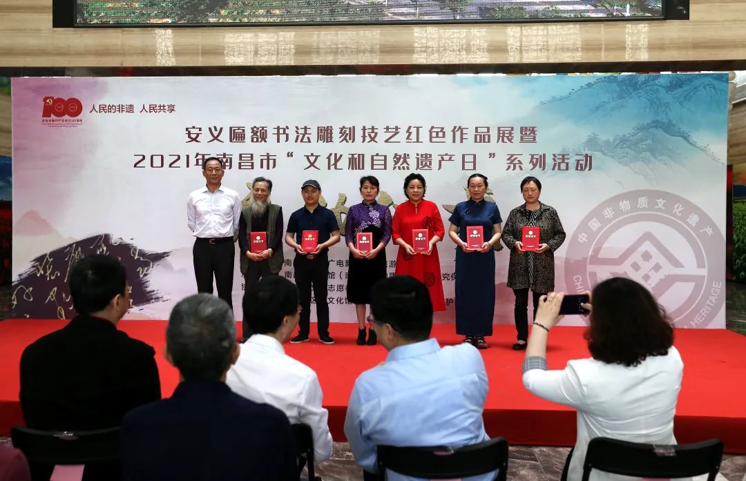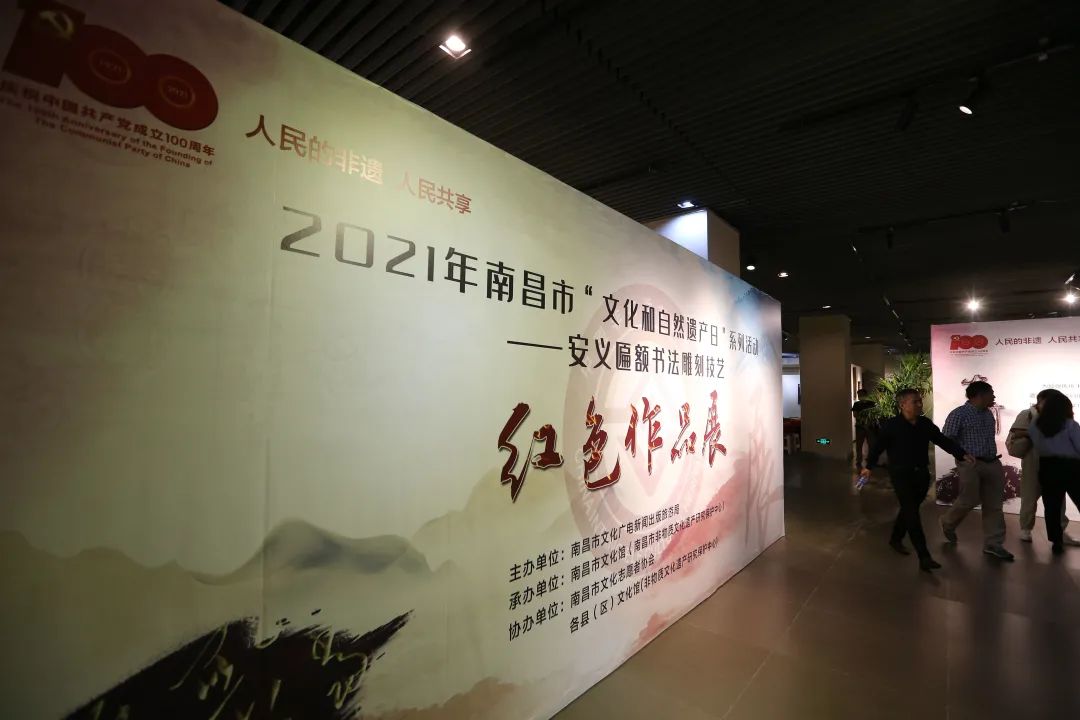 为大力弘扬优秀传统文化,充分展示近年来我市非物质文化遗产保护工作的丰硕成果,提高全社会的保护意识,促进非物质文化遗产在群众中更好的传承发展,向中国共产党建党百年献礼,5月25日上午,由南昌市文化广电新闻出版旅游局主办,南昌市文化馆、南昌市文化志愿者协会承办,各县(区)文化馆协办的安义匾额书法雕刻技艺红色作品展暨2021年南昌市“文化和自然遗产日”系列活动在南昌市文化馆一楼朝阳展厅启动。