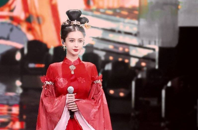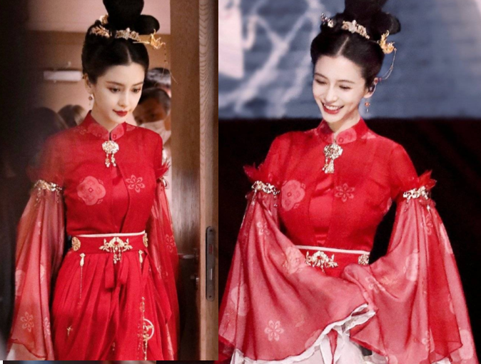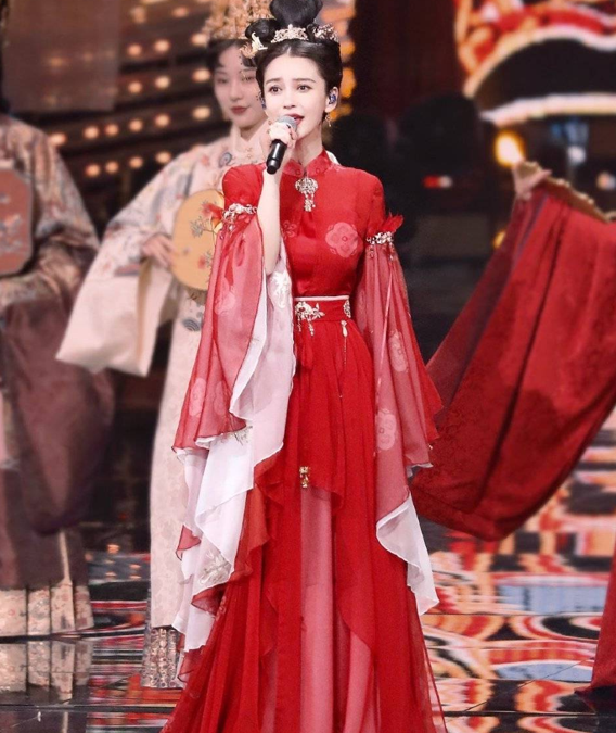 红衣的古风造型非常适合baby,她的皮肤白皙,红色将她的肤色衬托得如白雪一般,眼睛瞪得溜圆,整个人显得特别俏皮活泼,她站在台上,不用做什么就让人感觉很美好。