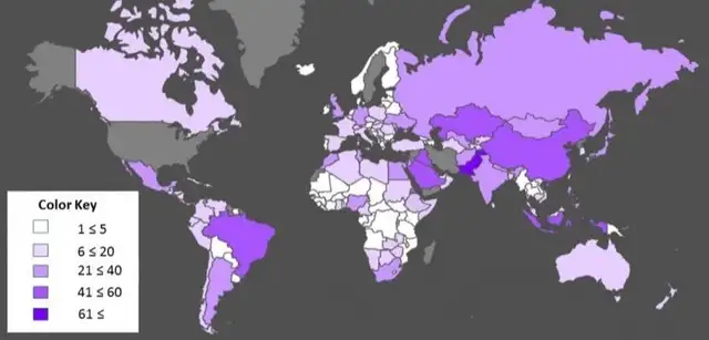 (截至2018年,全世界国家和地区的IVLP受邀人数,注意颜色深的几个地方)