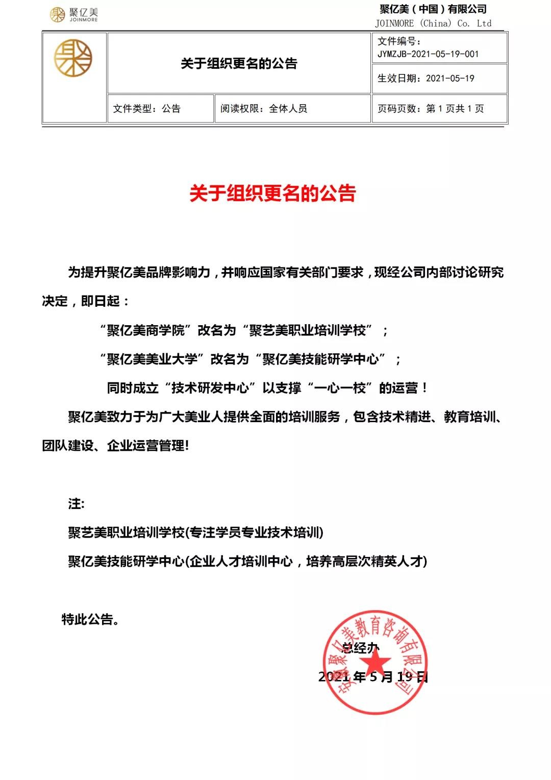 1、“聚亿美商学院”正式更名为“聚艺美职业培训学校”;