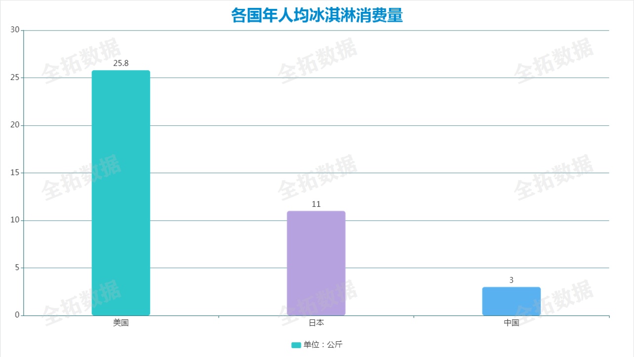 尽管如此,我国冰淇淋年人均水平还是显著低于美国、瑞士、日本发达国家。我国人均冰淇淋消费量仅3公斤左右,远低于美国人均25.8公斤的消费水平,也大幅低于亚洲最高的日本(11公斤)。由此可见,市场仍然拥有很大的发展空间。
