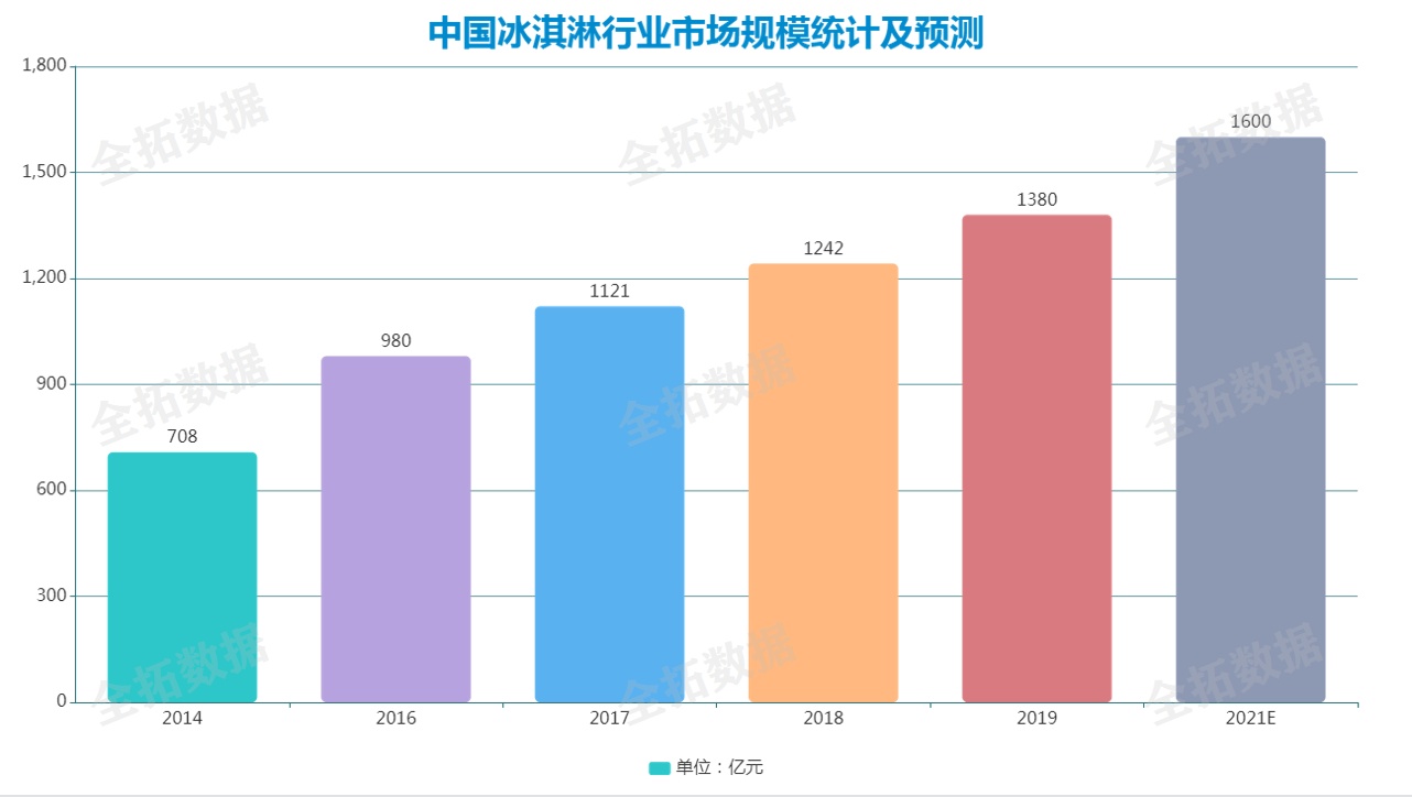 全拓数据显示,2014年,中国冰淇淋市场规模仅有708亿元,2019年,全国市场总量达1380亿元,消费跃居世界第一。去年疫情期间冰淇淋意外地成为食品行业一匹黑马;预测今年全国市场规模有望超过1600亿元。