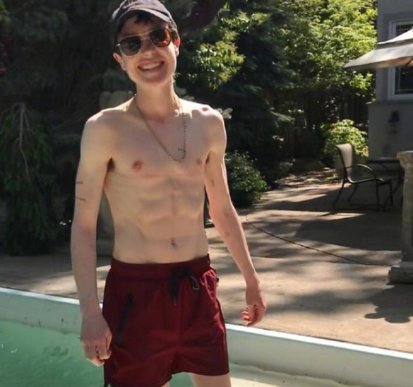 引人注意的是,艾略特·佩吉身上只穿一条深红色泳裤,赤裸半身大秀8块腹肌,肌肉线条分明,与他纤瘦的四肢对比起来显得有些突兀。但不得不说,从艾略特·佩吉的身上已经看不出明显的女性特征了。