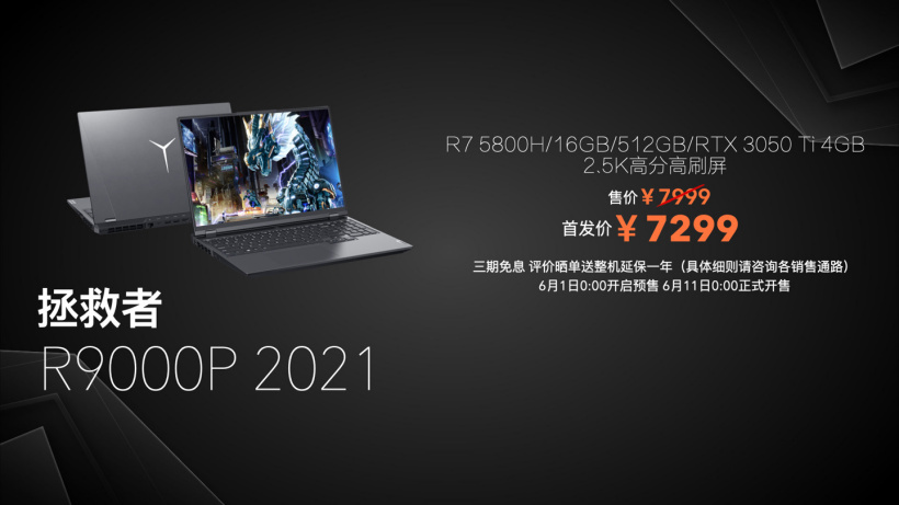 拯救者 R9000P 2021 仅有一个版本,搭载 AMD R7 5800H 处理器,配备 RTX 3050Ti 显卡,售价 7299 元,6 月 1 日开售。