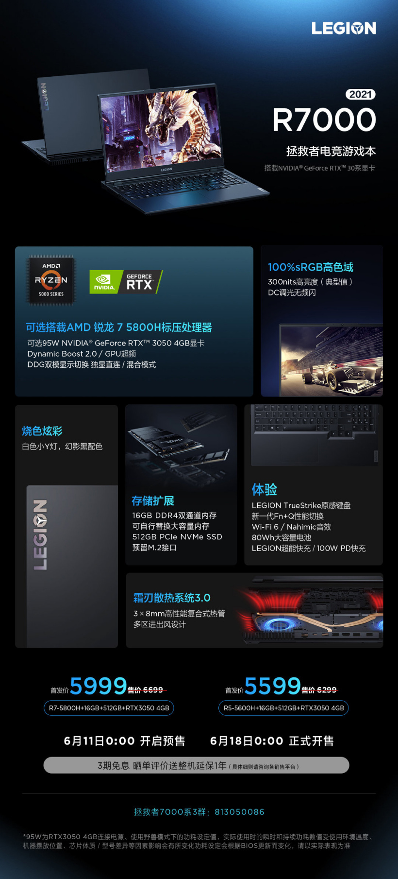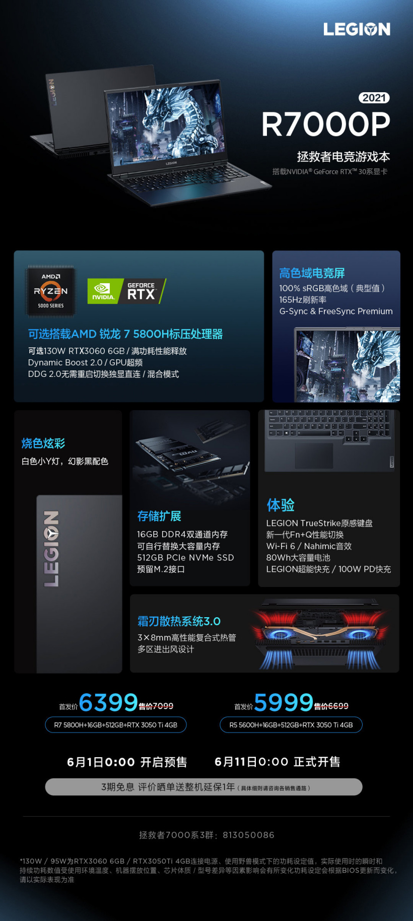 拯救者 R7000 2021 可选 R5 5600H/R7 5800H 处理器,辅以 RTX 3050 显卡,售价 5599 元和 5999 元,6 月 11 日开售。