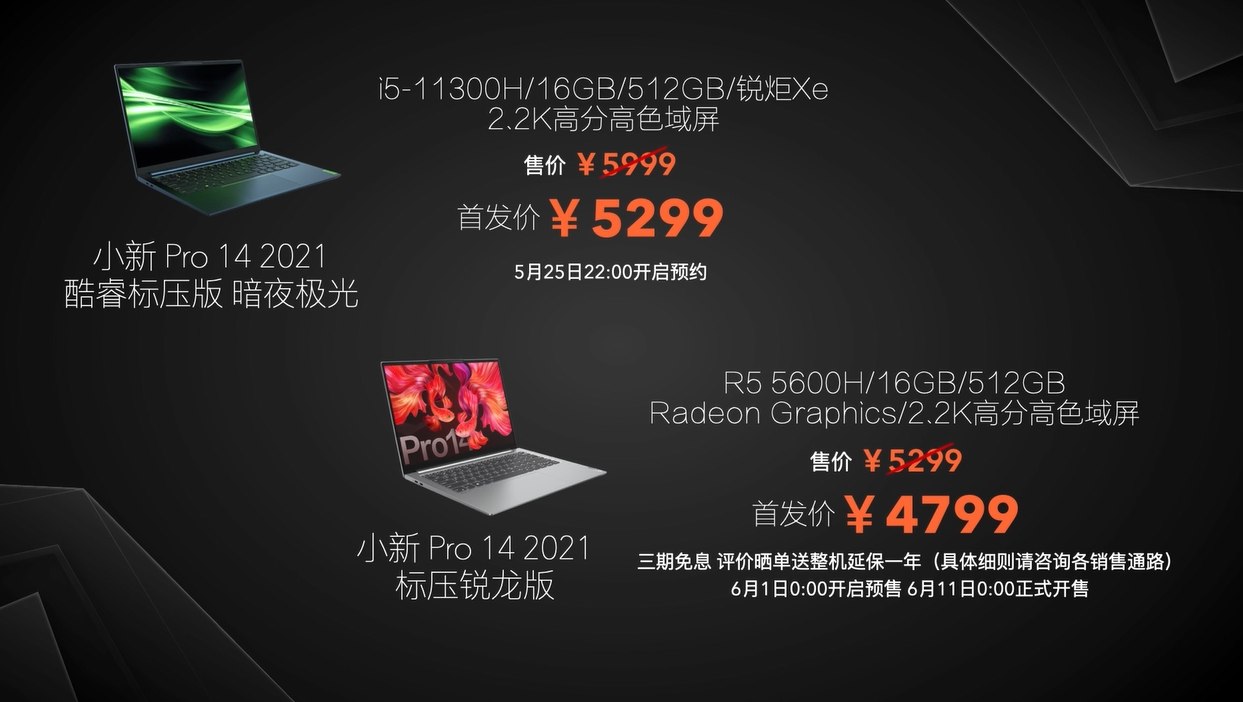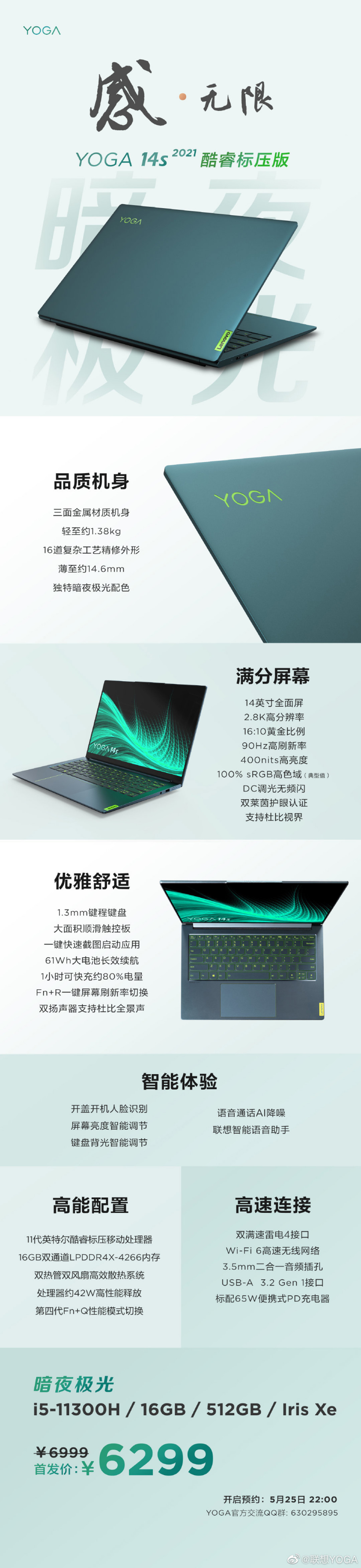 小新 Pro 14 2021 酷睿标压版暗夜极光将于 5 月 25 日 22:00 开启预售,首发价 5299 元。