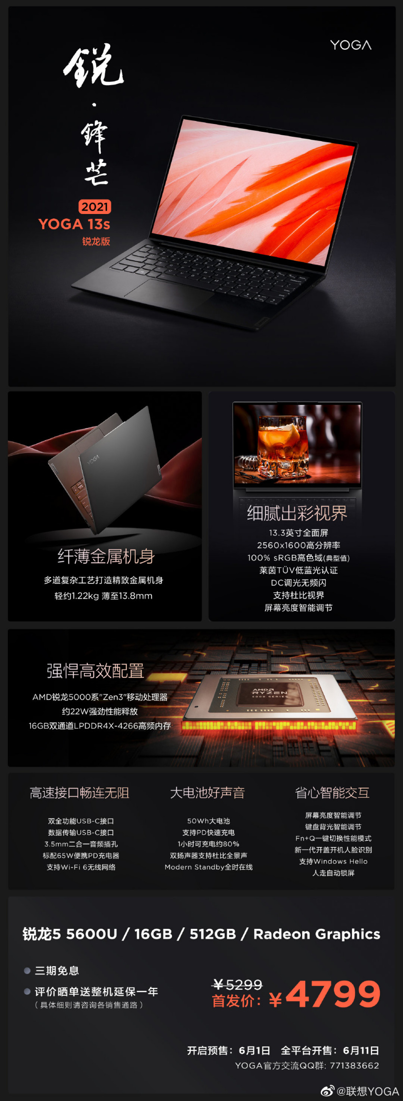这款联想 Yoga 13s 2021 锐龙版,搭载 AMD R5 5600U 处理器,配备 16GB 双通高频内存 + 512GBSSD,售价 4799 元。