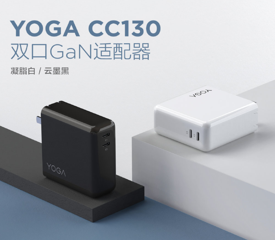 YOGA CC130 充电器有凝脂白、云墨黑两款配色,支持单口 100W,以及双口 100+30W,可智能分配输出功率,兼容 PD 3.0/QC 3.0/PPS 协议。