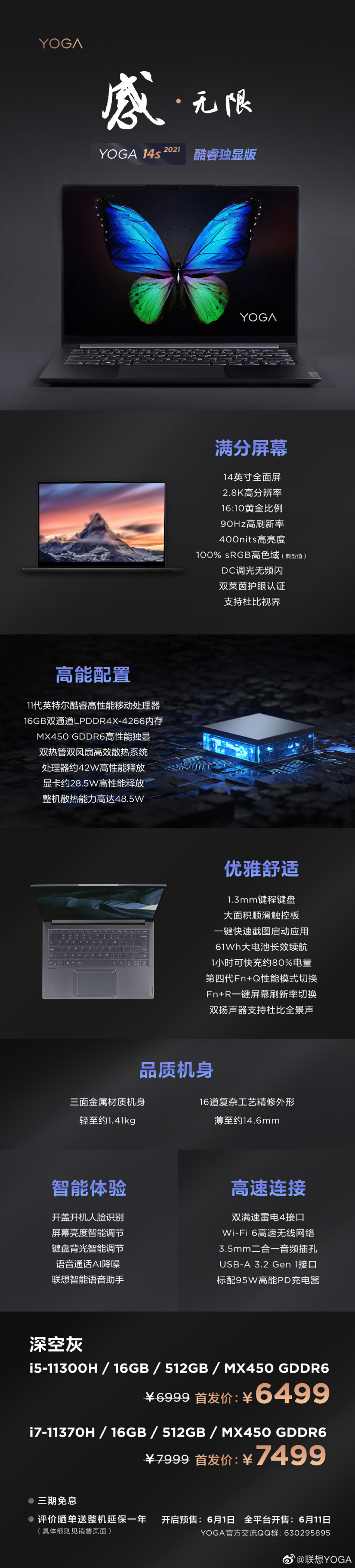 酷睿独显版和酷睿标压版相对来说类似,后者仅有 i5-11300H 版本,售价 6299 元,前者提供 i5-11300H 和 i7-11370H 处理器可选,辅以 MX450 独显,售价 6499/7499 元,具体信息如下图:
