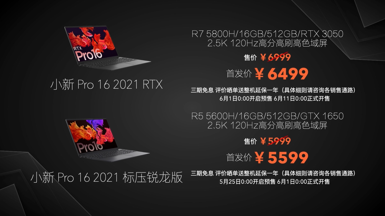,联想小新 Pro 16 2021 RTX 首发价 6499 元,将于 6 月 1 日开启预售;锐龙标压版首发价 5599 元,5 月 25 日开启预售。
