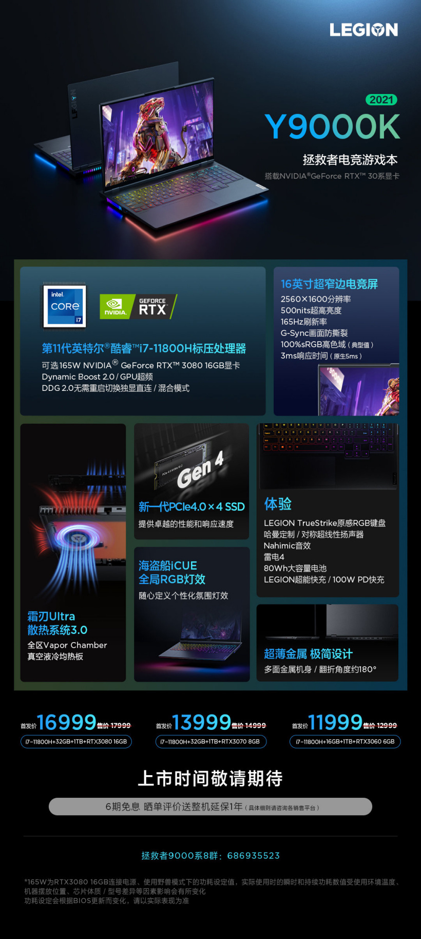 拯救者 Y9000K 2021 标配英特尔 11 代酷睿 i7-11800H 处理器,可选 RTX 3060/3070/3080 独显,配备 2.5K 高刷屏,售价自 11999 元至 16999 元,不过官方没有公布上市日期。