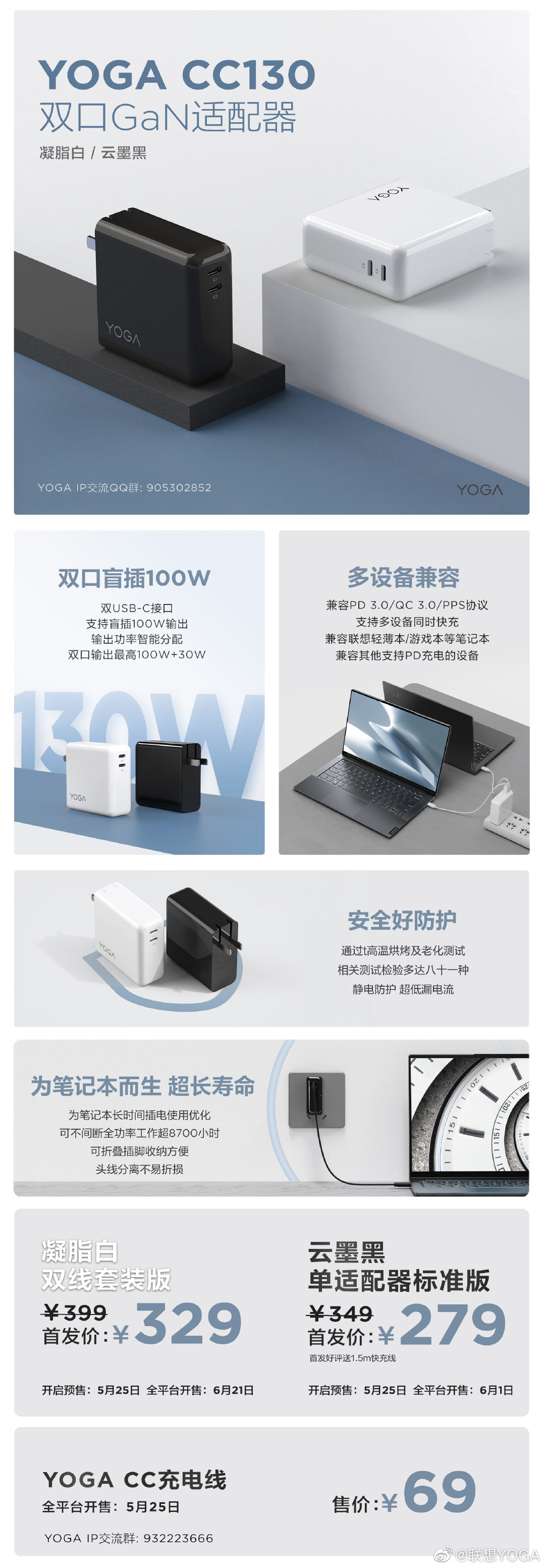 YOGA CC130 凝脂白双线套装版首发价 329 元,云墨黑单适配器版首发价 279 元,都是 5 月 25 日开启预售。