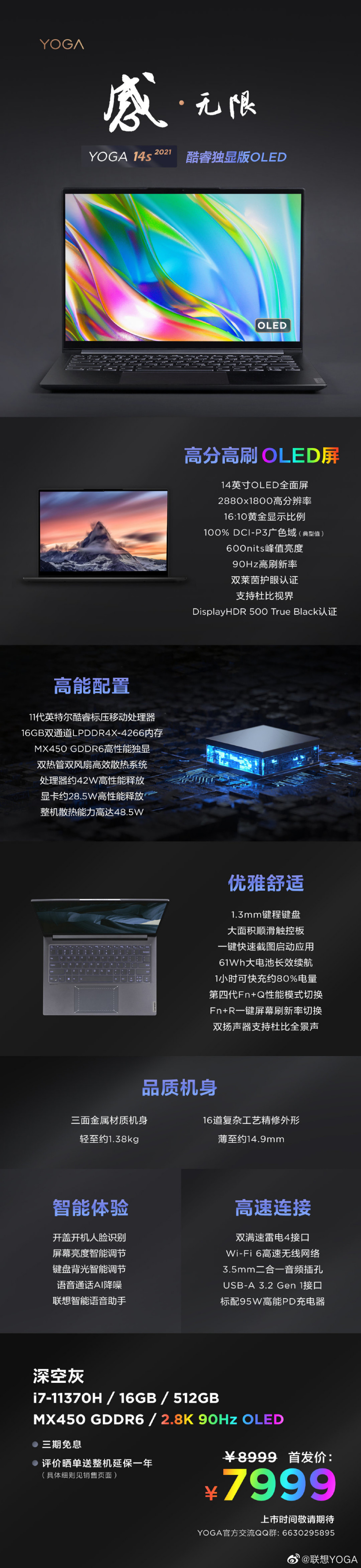 其他方面,该机重 1.38kg,厚 14.9mm,提供双满速雷电 4 接口、3.5mm 孔、USB-A 3.2 Gen1 接口,标配 95W 高能 PD 充电器,首发价 7999 元。