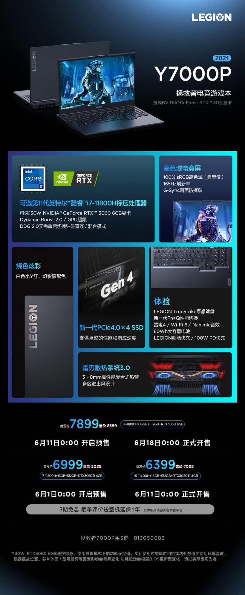 拯救者 Y7000P 2021 可选英特尔 11 代酷睿 i5/i7 处理器,辅以英伟达 RTX 3050Ti 或 3060 显卡,配备高色域电竞屏,售价 6399 元至 7899 元,6 月 1 日开售。