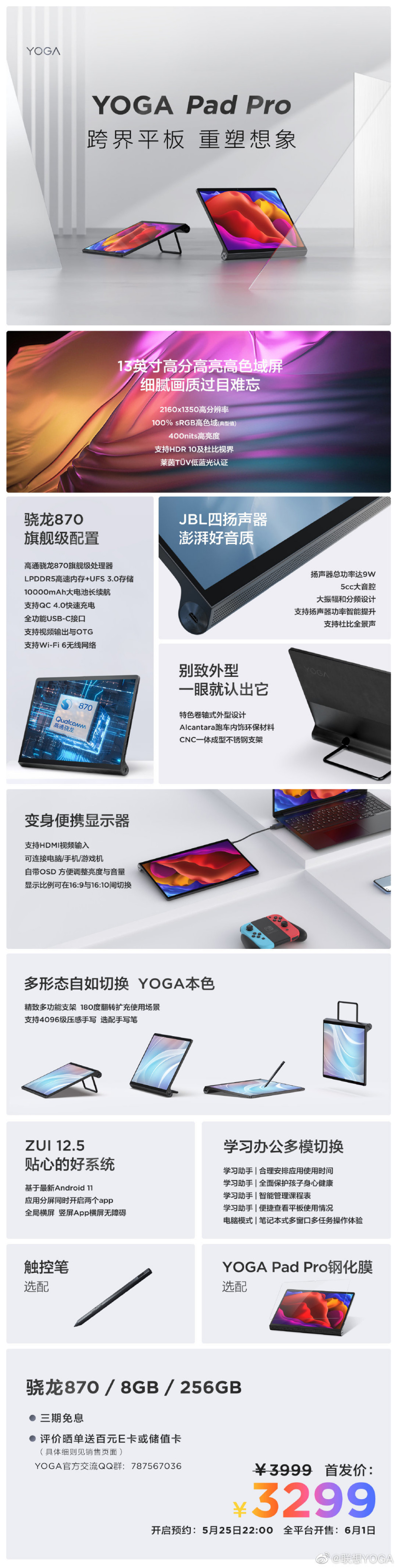 这款平板搭载高通骁龙 870 芯片,辅以 LPDDR5 高速内存 + UFS 3.0 存储,采用 13 英寸 2160x1350 分辨率、100% sRGB 色域、400nits 亮度、支持 HDR 10 及杜比视界、通过莱茵 TÜV 低蓝光认证的顶级屏幕。