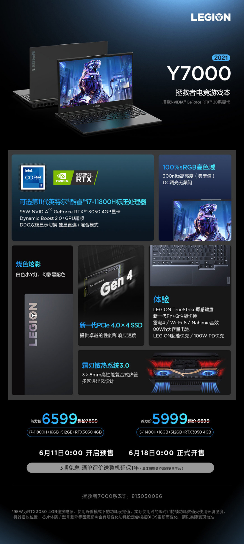 拯救者 Y7000 2021 仅有 RTX 3050 版本,i5 和 i7 版本售价分别为 5999 元和 6599 元,6 月 11 日开售。