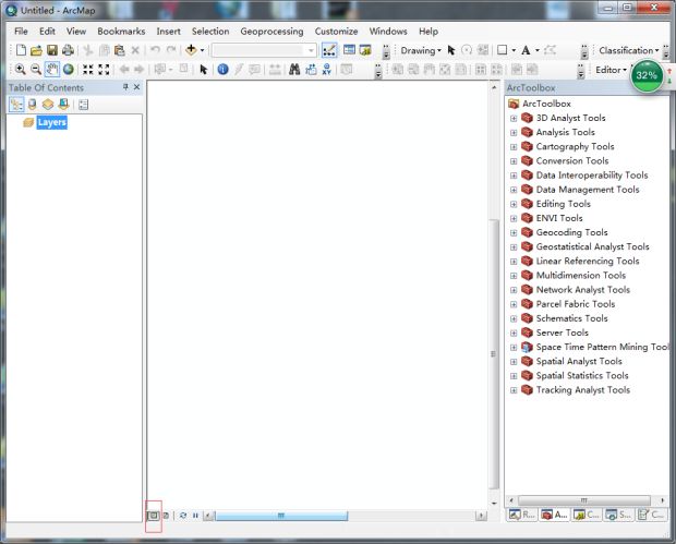 打开ArcMap软件,在其地图显示窗口中,ArcMap提供了两种地图显示状态:数据视图和布局视图。数据视图是用户进行数据查询、检索编辑和分析等操作的界面,而布局视图是用来制作地图的界面,图名、图例、比例尺、指北针等地图辅助要素便可加载其中。两种制图方式可通过窗口左下角的两个按钮进行切换(图1:数据视图;图2:布局视图)。