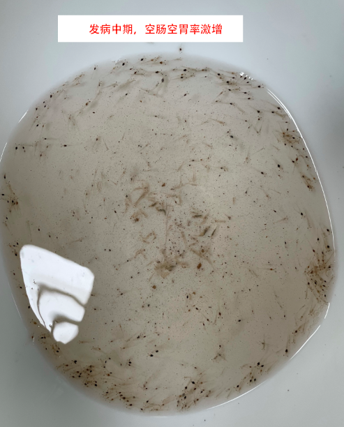 (3) 发病苗池陆续出现大量掉苗,在3-4天内,整批次虾苗均出现病情,无奈排苗。