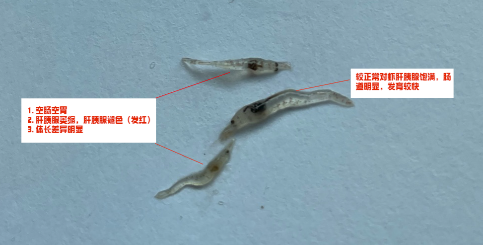(2) 在标苗第4-5天开始,空肠空胃率开始激增,苗体通体发白或透明,苗池内虾苗发育尺寸差异大(见下图)。