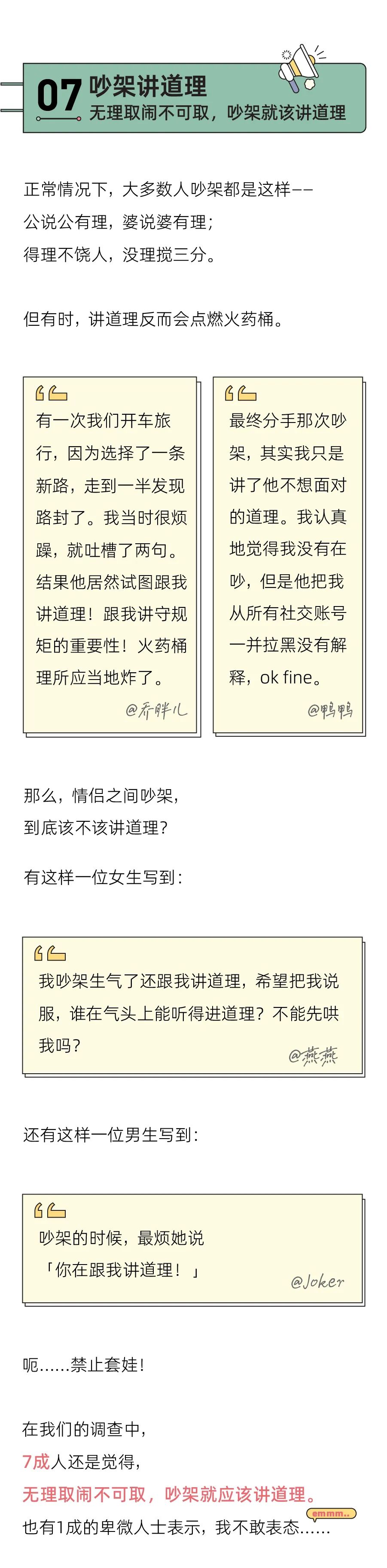 然而,吵架并不可怕,甚至有些情侣吵架,越吵感情越好。这是为什么呢?换个角度想,吵架,不过是一种“声音大一点的讨论”。福田健在《谁说我们不能生气》中写到:生气是一种极其正常的生活状态。生气的表达,目的是为了表达反对意见、改善心情,获得积极地改变。只是,你需要一点技巧,来规避生气带来的恶劣影响。