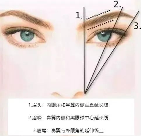 按照上图给眉毛(1、2、3)三点定位,保持眉头和眉尾基本在同一水平线上,或者眉尾略高于眉头0.3-0.5cm,