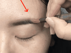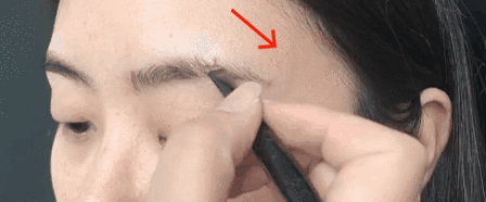 这时,可以准备一支比眉粉略深一色的眉笔,从眉部缺损处顺着眉毛的方向,竖立起笔尖,添加几根,使真假毛发混合。