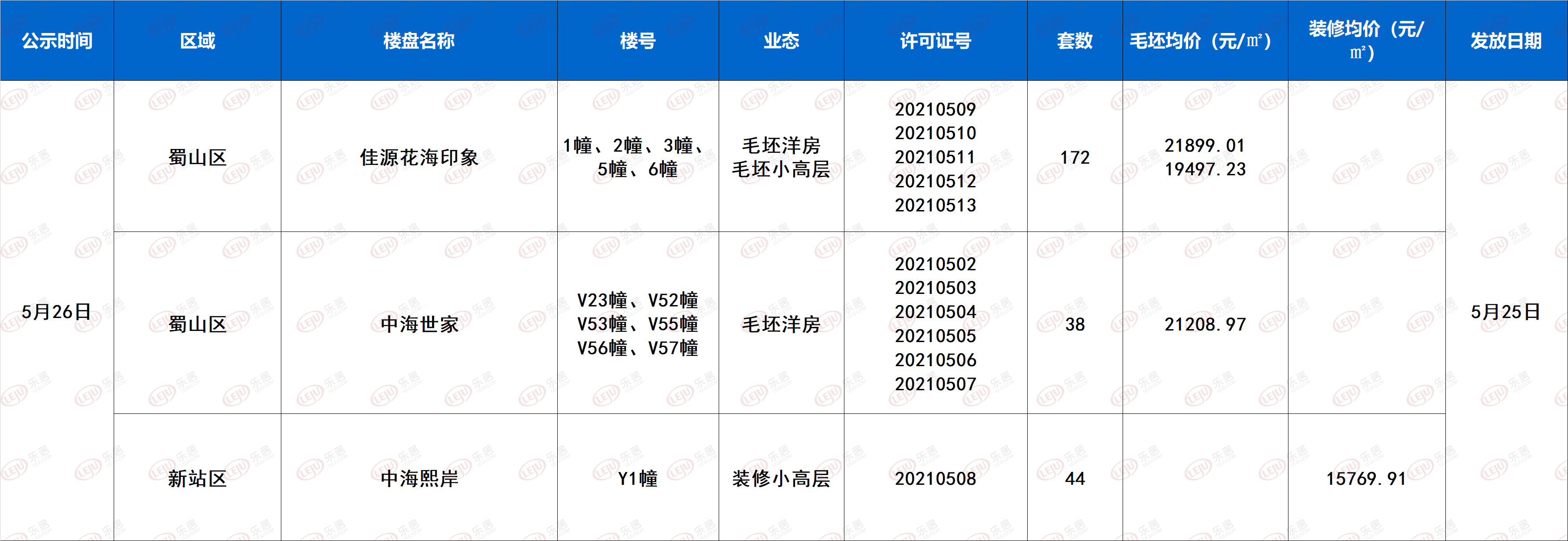 1、蜀山区佳源花海印象1幢(预售许可证号:20210509)、2幢(预售许可证号:20210510)、3幢(预售许可证号:20210511)、5幢(预售许可证号:20210512)取得预售证,毛坯洋房,共128套房源,户型面积分别为118㎡-200㎡、117㎡196㎡、116㎡-225㎡、116㎡-205㎡。均价21899.01元/㎡。