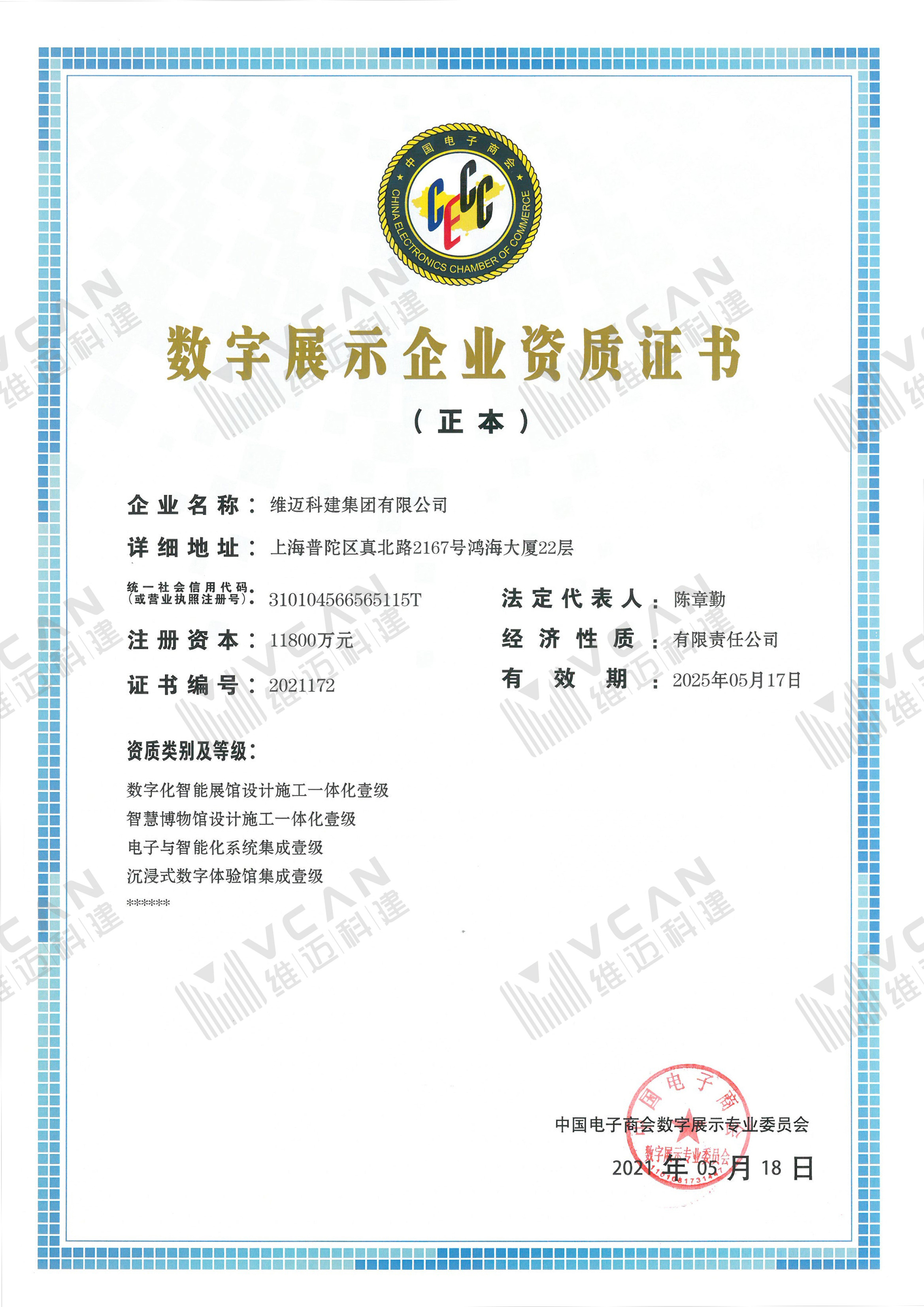 继今年四月,在中国电子商会数字展示专业委员会常务理事会上,维迈科建集团成功当选“中国电子商会数字展示专业委员会”副会长单位之后再传佳音!近日,在数字展示企业资质方面喜获丰收,荣获由中国电子商会数字展示专业委员会认证的数字展示领域四项壹级资质——