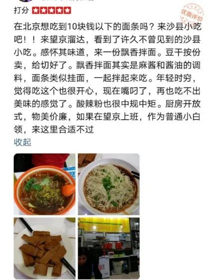 一条来自2018年的评价便显示:“来望京溜达,看到了许久不曾见到的沙县小吃。感怀其味道,来一份飘香拌面。豆干按份卖,给切好了。飘香拌面其实是麻酱和酱油的调料,面条类似挂面,一起拌起来吃。年轻时穷,觉得吃这个也很开心,现在嘴叼了,再也吃不出美味的感觉了。”