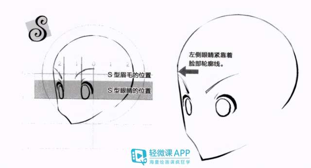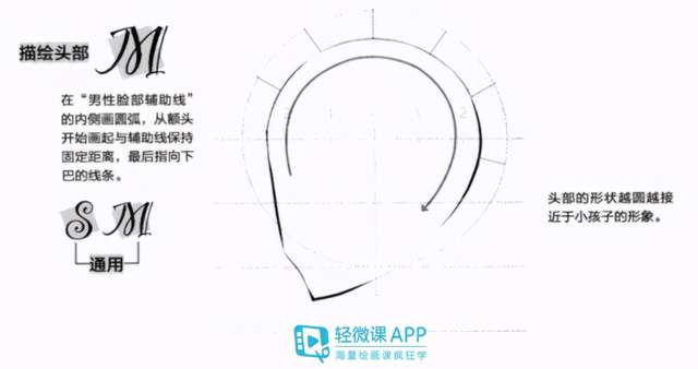 在“男性脸部辅助线”的内侧画圆弧,从额头开始画起与辅助线保持固定距离,最后指向下巴的线条。头部的形状越圆越接近于小孩子的形象。注意S·M是通用的。