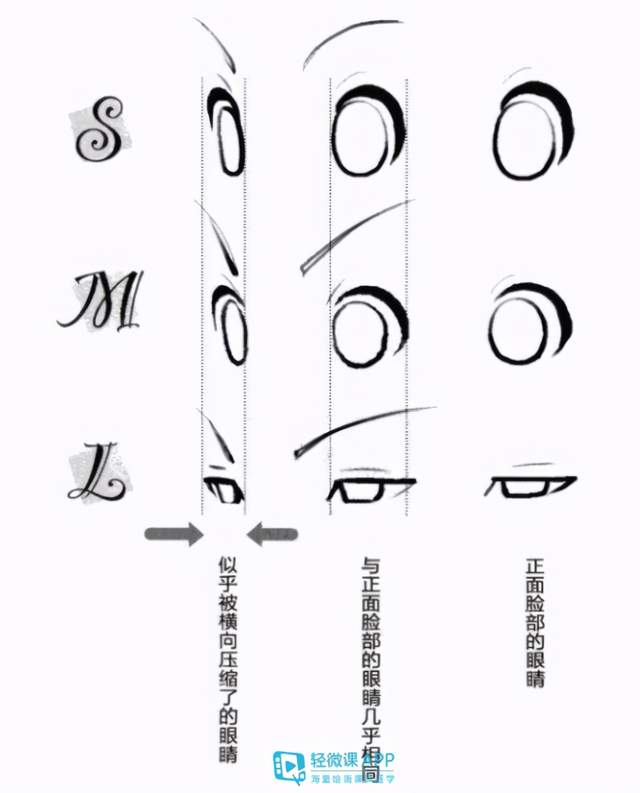 按照S·M·L的顺序,人物的眼睛越来越扁。
