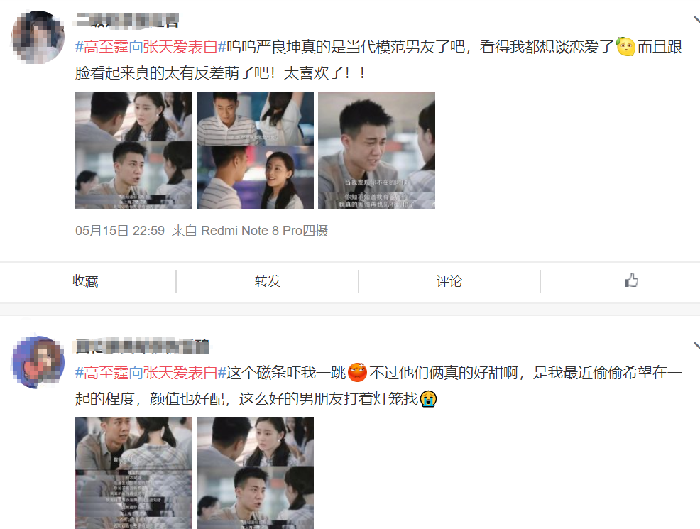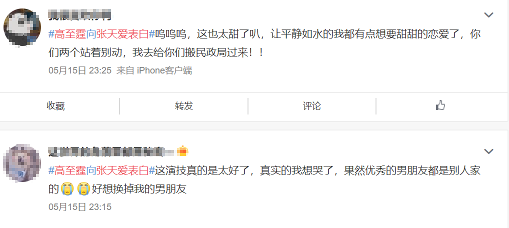 这种极具共情力的演技,也让观众们纷纷入戏,当高至霆终于鼓足勇气在机场告白张天爱的时候,网友们开心的仿佛自己恋爱了一般↓