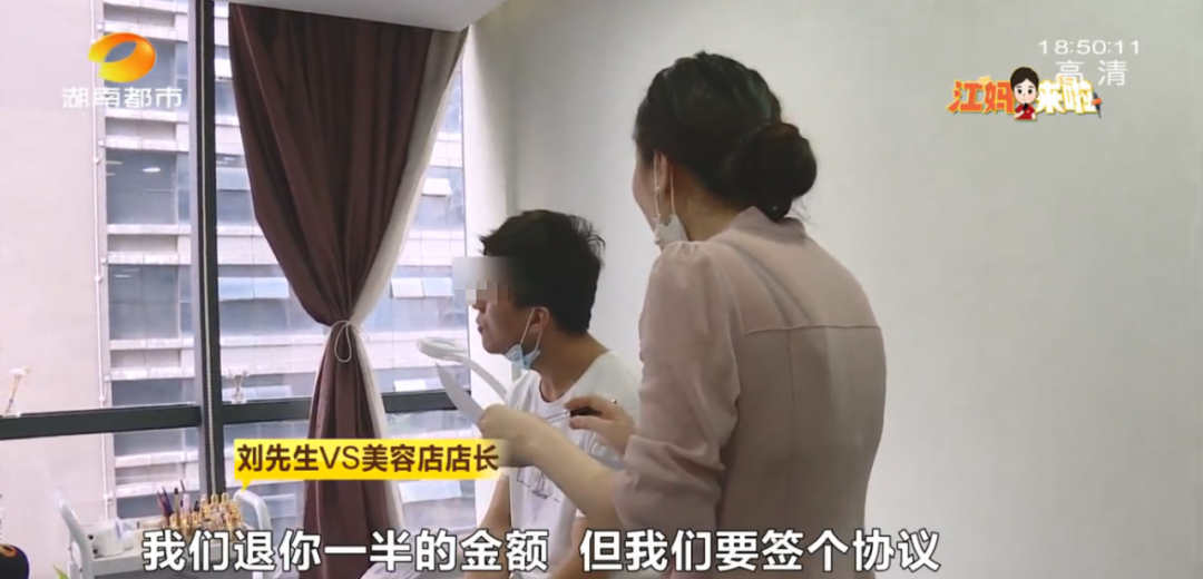经过现场沟通,这家美容店与刘先生签订协议,承诺在5个工作日内退还50%的费用,但有前提条件。