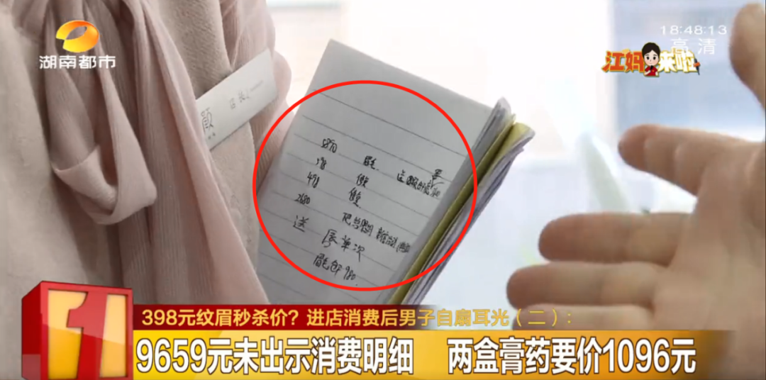 5月20号刘先生共计消费9659元,但对方并未出示消费清单,每个项目的收费具体是多少,刘先生表示并不清楚。然而当记者提出要查看一下,刘先生的店内消费记录本时, 美容店店长却将消费明细紧紧攥在手里、不愿提供给大家查看。