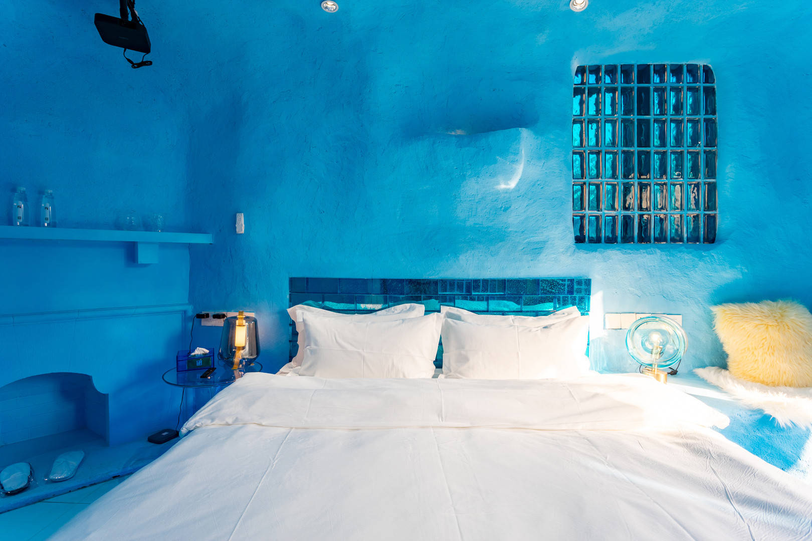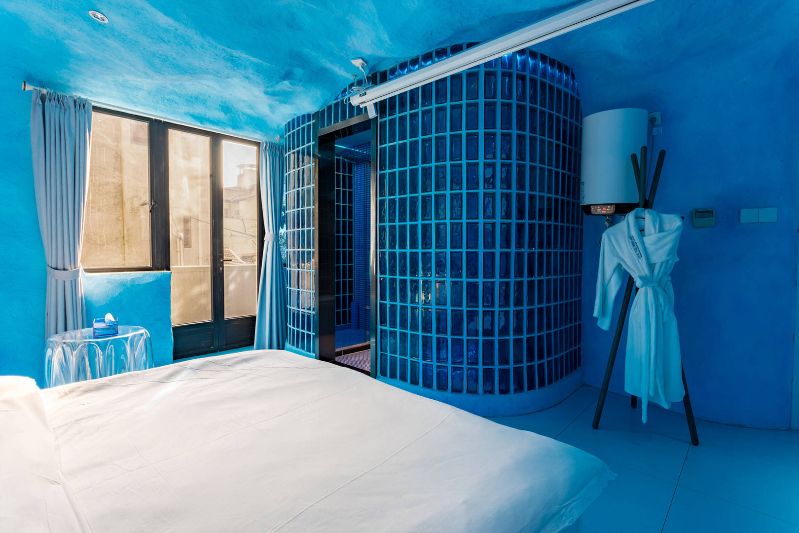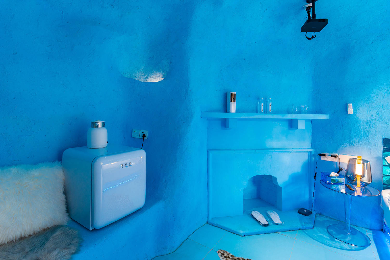 今天说的这家民宿属于纯蓝风格,就像房东介绍的那样,冰窖民宿。这家民宿的颜值还是蛮高的,房间确实非常漂亮,墙壁粉刷成蓝色,小冰箱是蓝色,马桶也是蓝色,吹风机也是蓝色,感觉就是冰窖该有的样子。