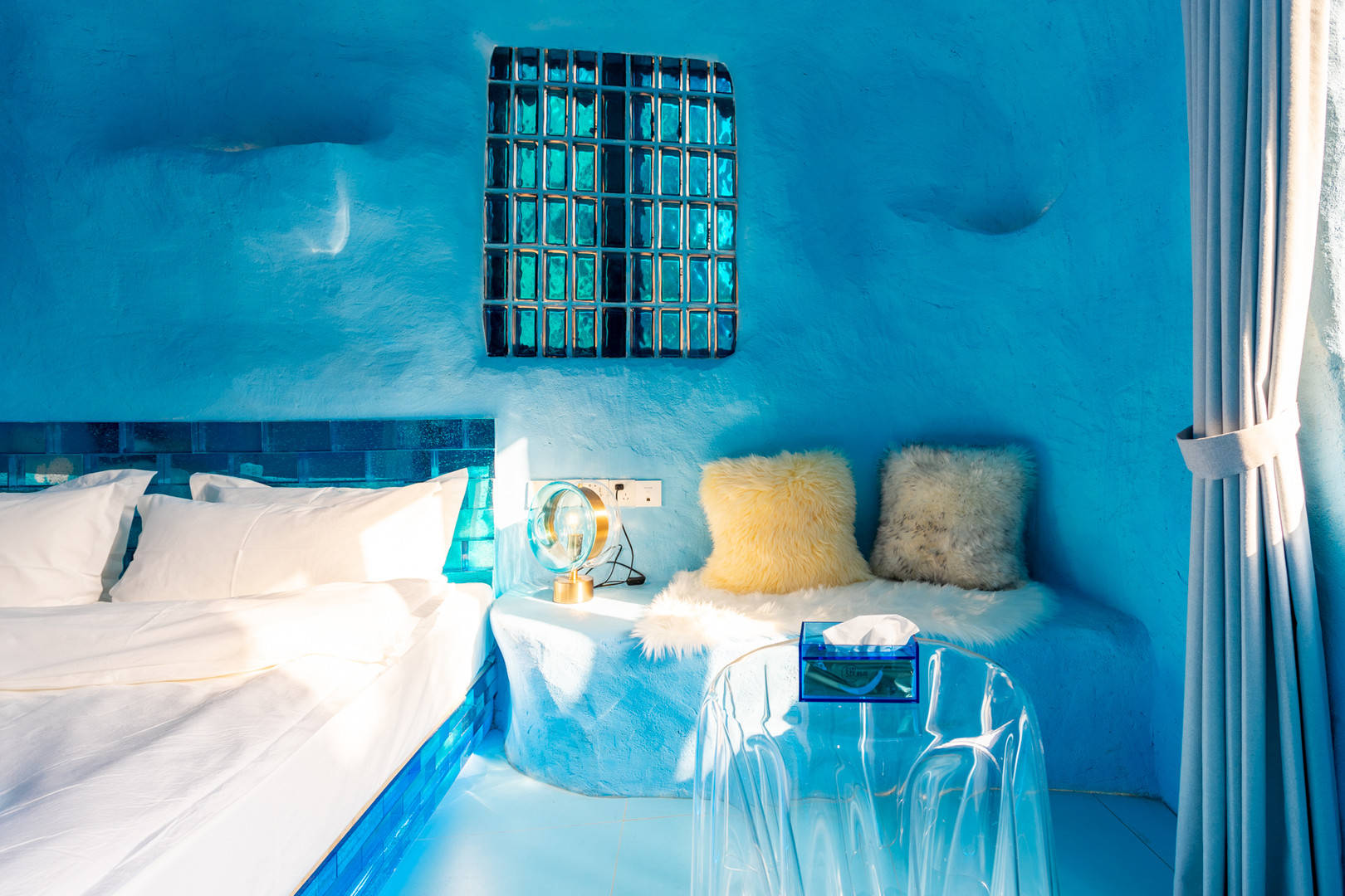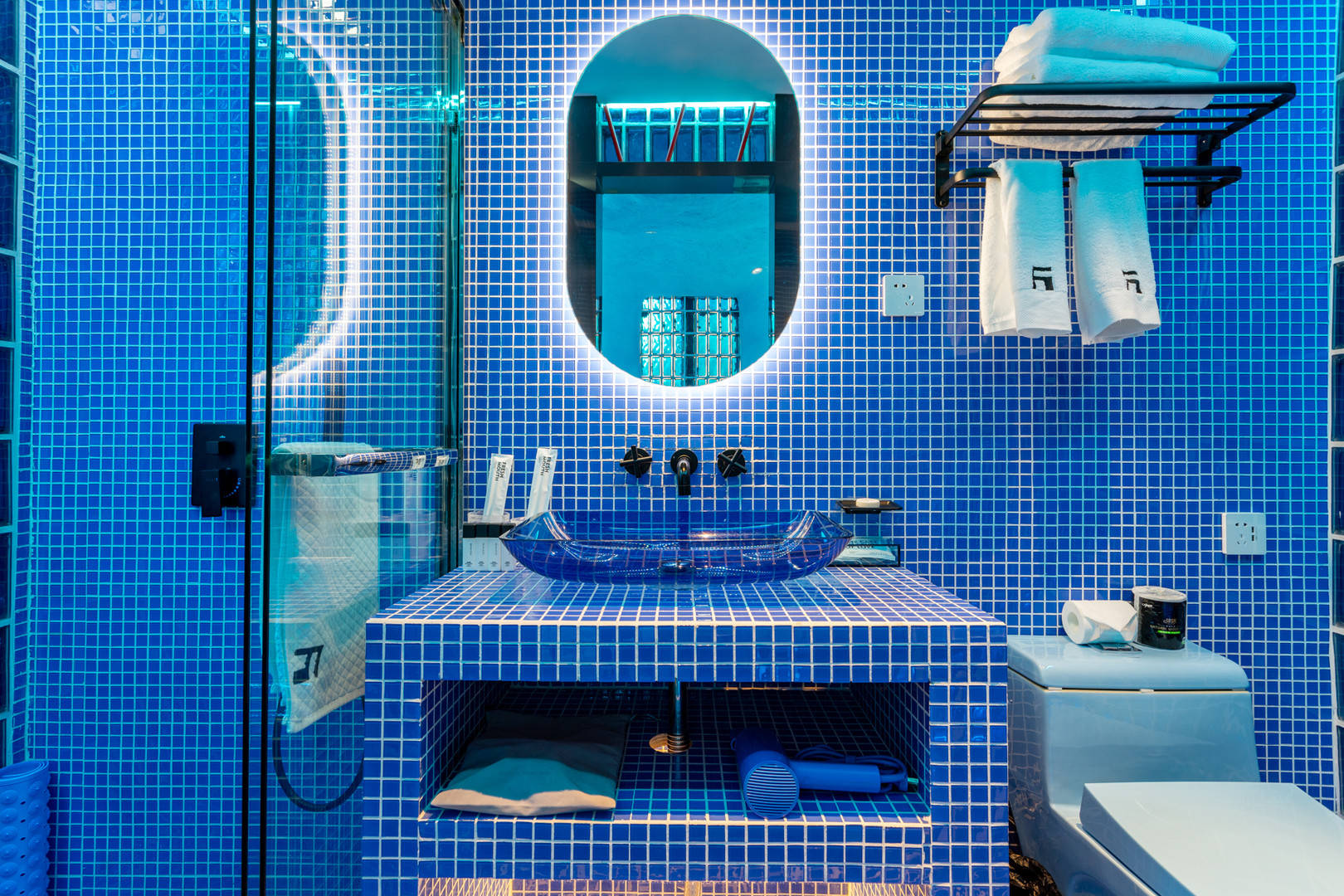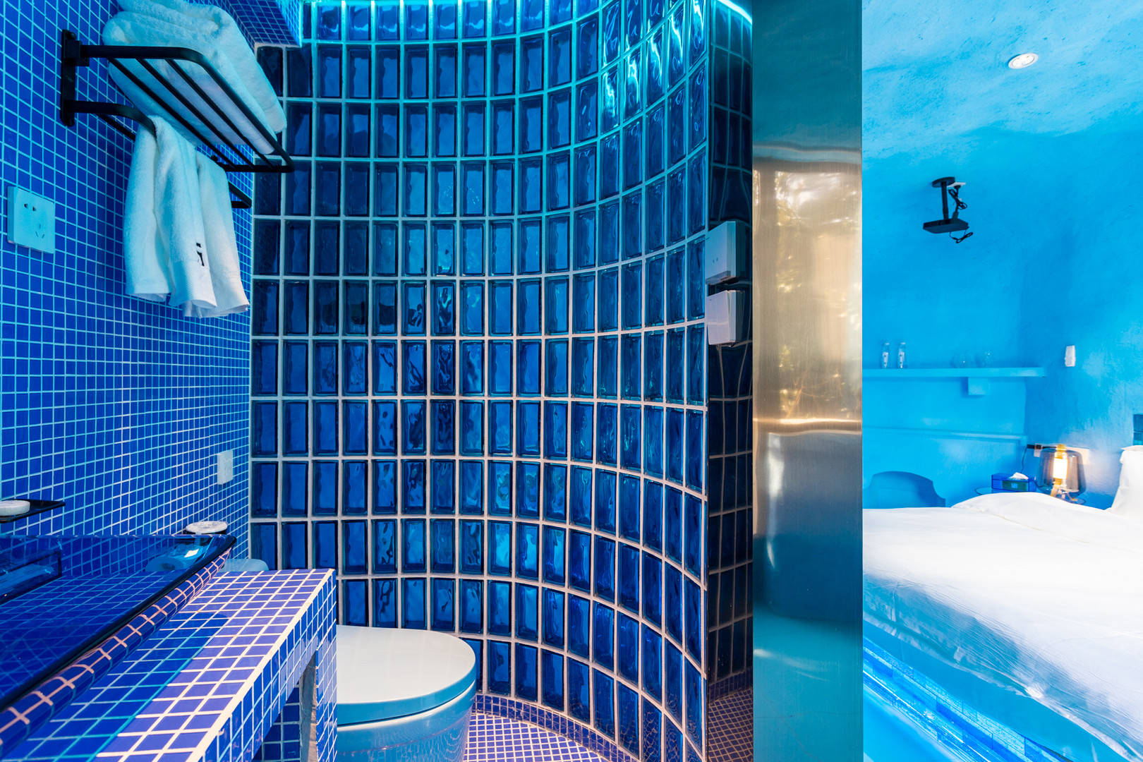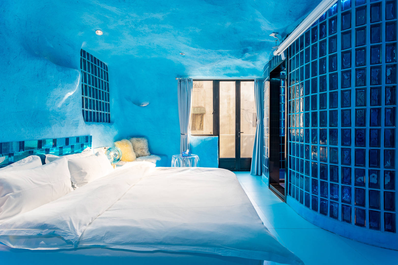 今天说的这家民宿属于纯蓝风格,就像房东介绍的那样,冰窖民宿。这家民宿的颜值还是蛮高的,房间确实非常漂亮,墙壁粉刷成蓝色,小冰箱是蓝色,马桶也是蓝色,吹风机也是蓝色,感觉就是冰窖该有的样子。