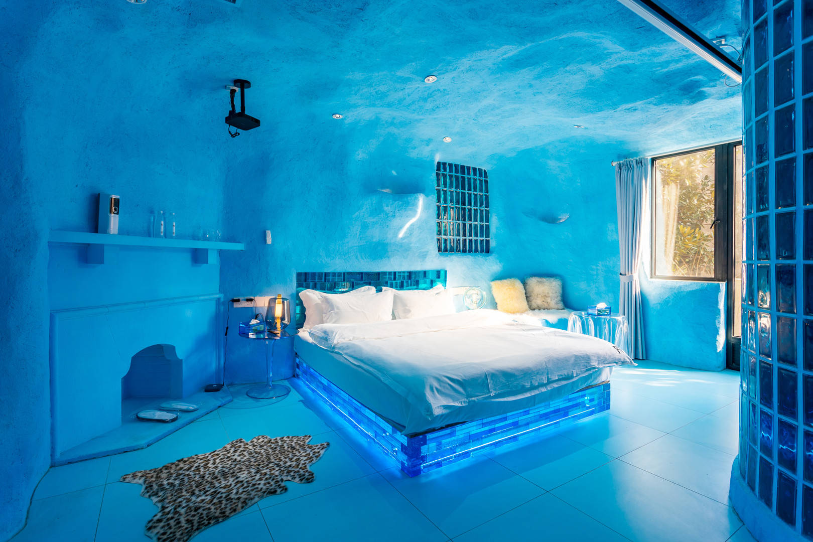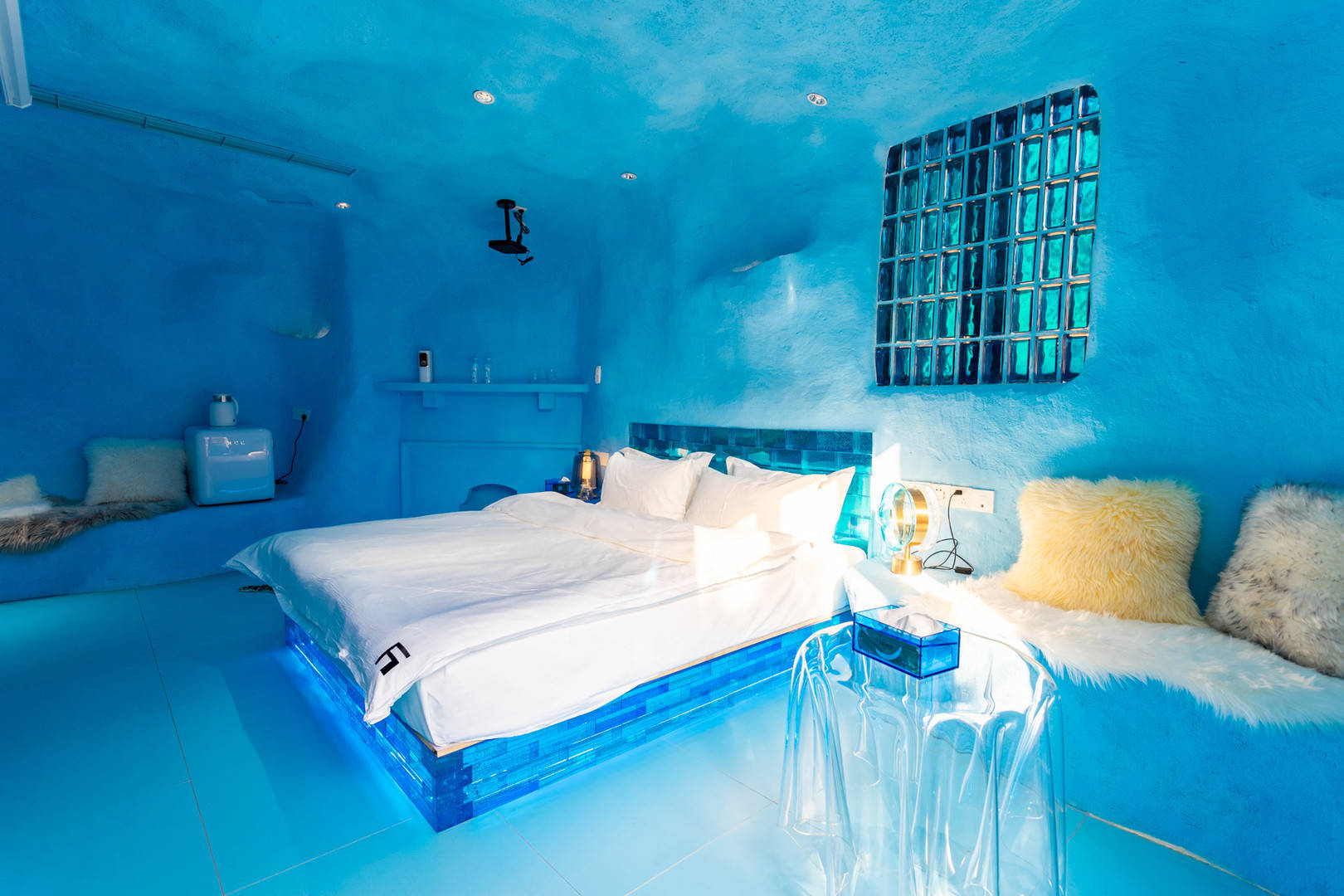 冰窖,其实只是这家民宿的宣传噱头而已,并不是真的在冰块里打造的民宿,而是将民宿装修成了冰窖的效果,的确,拍出来的照片也是非常有冰窖效果的,特别是大床下面的材质,感觉就是真冰床铺。