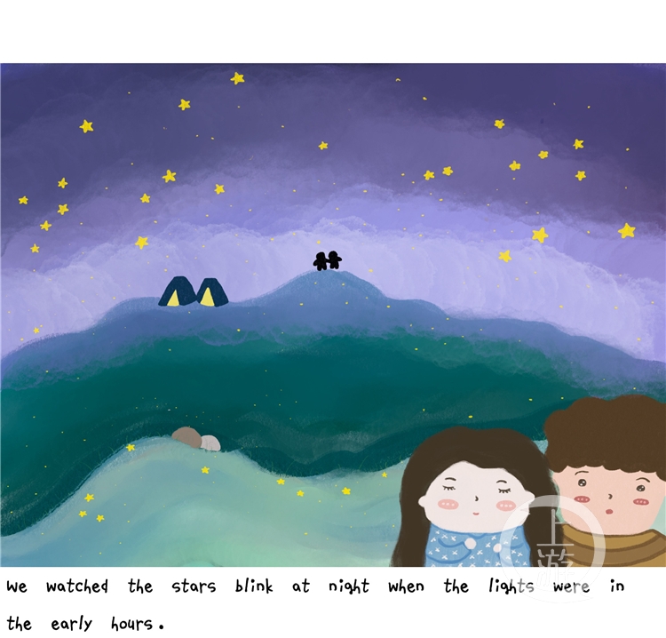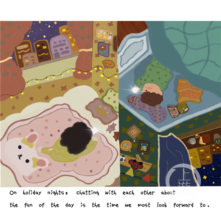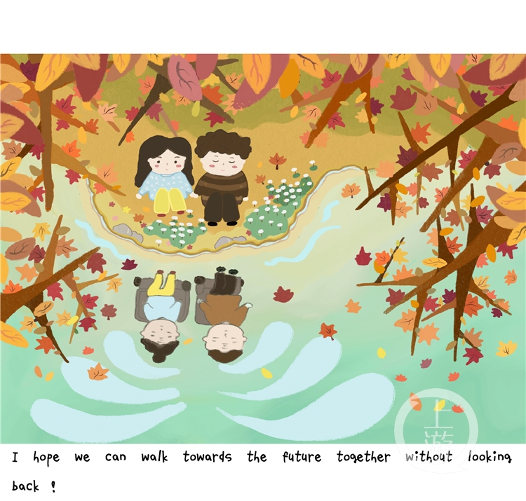 在插画中,她画出和男孩安静地坐在一起,水里的倒影是两人老了以后的样子。“他总会在我害怕或难过时保护我。”“在假期的晚上,打电话彼此聊着这一天的趣事,是我们最期待的。”在李婧喜的笔下,这份纯洁的恋爱,像一条点缀着彩虹的小路,甜美又带有憧憬地轻轻铺开。