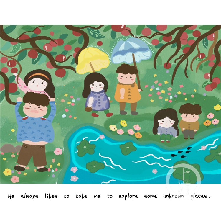 为完成这件作品,她采访了外婆、妈妈和弟弟的同学,分别了解他们童年的记忆。“弟弟的回答是最喜欢和同学玩ipad游戏。我很喜欢妈妈那个年代的童年,他们在山中尽情玩耍,下河摸鱼,上树采果,跳橡皮筋……很幸运我的童年也很快乐,因为是‘放养式’的。”婧喜笑道。