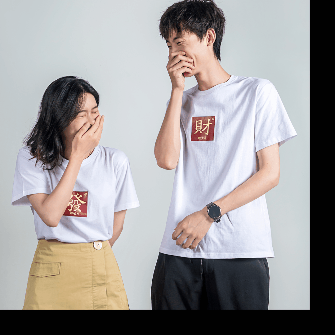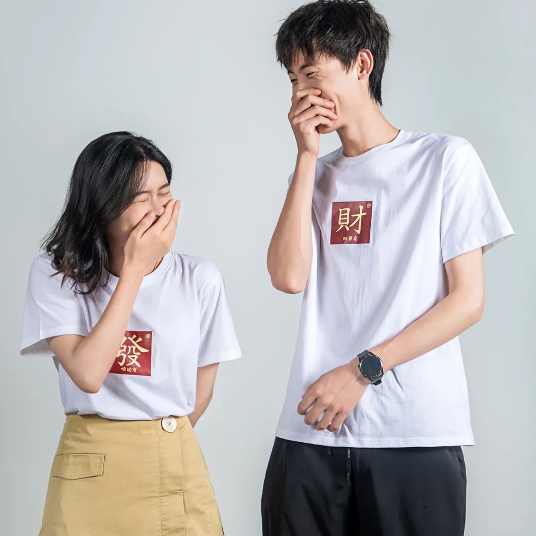 这两款T恤把麻将文化和吉祥的祝福语复刻在衣服,中国红背景色+经典金色汉字,是地道的国潮风。