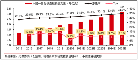 因为有越来越多的厂家发现一体化供应链有很多优势,所以近年来,这个市场的发展速度非常迅猛。2020 年我国一体化供应链市场规模将达到2万亿人民币,预计到 2025 年将进一步增长到3.2 万亿人民币,复合年增长率为 9.5%。渗透率预计将由 2020 年的 31.0%增长到 2025 年的 34.7%。