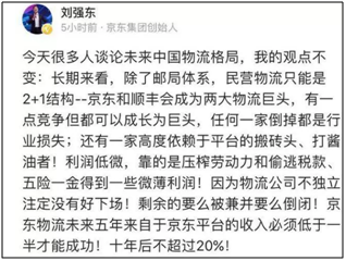 巧了,2017年6月,刘强东也做了一番预言,京东和顺丰会成为两大物流巨头,其他都是给阿里搬砖头、打酱油的。
