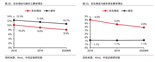效率提升的同时,经营费用率也在不断下降, 2018年、2019年及2020年分别为10.2%、9%以及8%,呈现持续下降趋势,且都低于顺丰,说明京东的成本管控能力要优于顺丰。