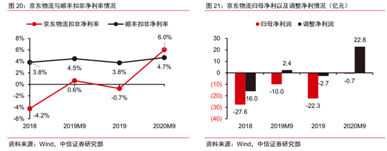 2020年前三季度京东物流实现净利润22.8亿元人民币,净利润率为4.6%,扣非净利率攀升至 6.0%,反超顺丰。