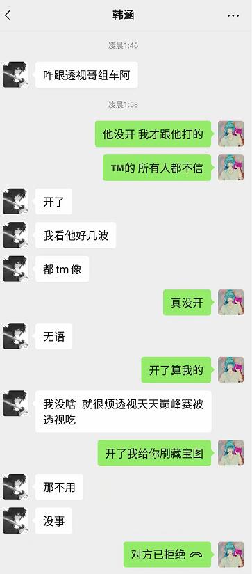结果反转出来了,寂然这么相信自己的队友,但是最后好友承认隐瞒寂然开了透视外挂,而原因是因为连胜号撞到了韩涵,自己不想输,所以开了外挂,而寂然得知此事后立刻对韩涵及TUT成员道歉,开挂的玩家也对TUT道歉,态度十分诚恳。