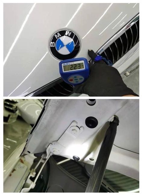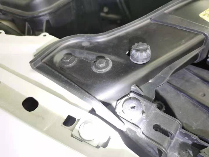 前机盖顶端喷漆,没有钣金,说明只是轻微的刮擦。掀开机盖查看合页固定螺丝,螺丝表面没有破损掉漆等拆卸拧动特征,原厂机盖无疑。