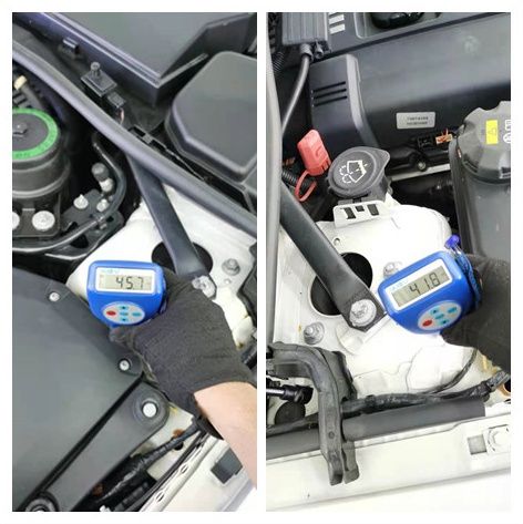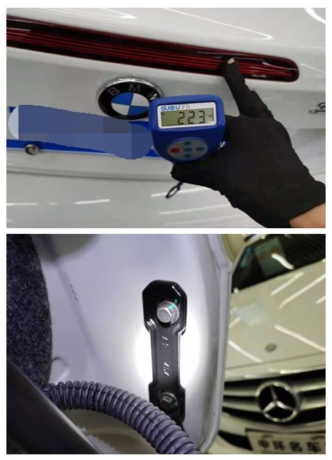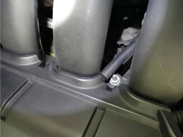 左右减震塔顶漆面厚度正常,没有钣金变形修复痕迹。但是减震固定螺丝分明拆过,猜测要么是改装,要么是正常的易损件维护更换,等下看看底盘情况,综合上下情况来判断才更科学。